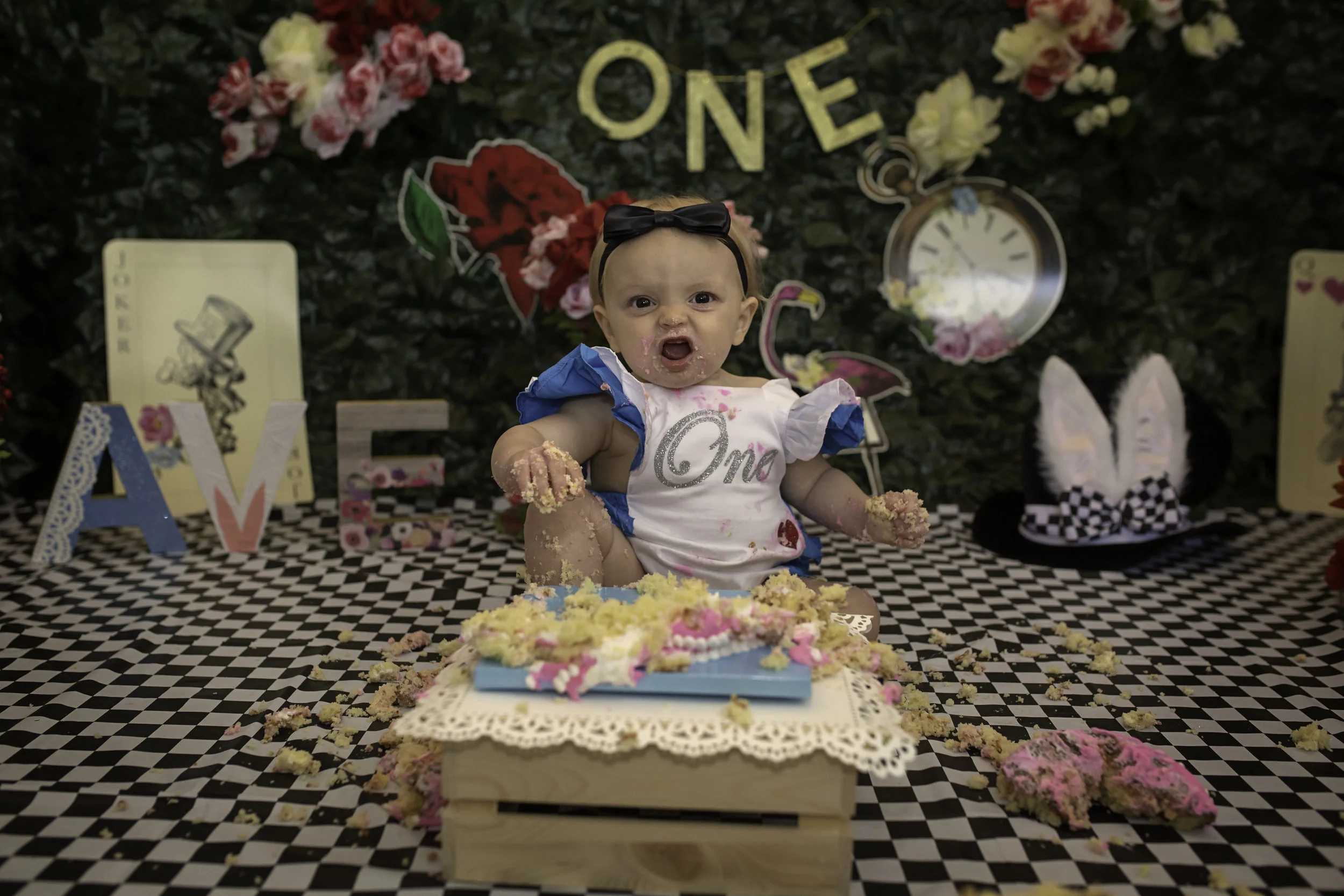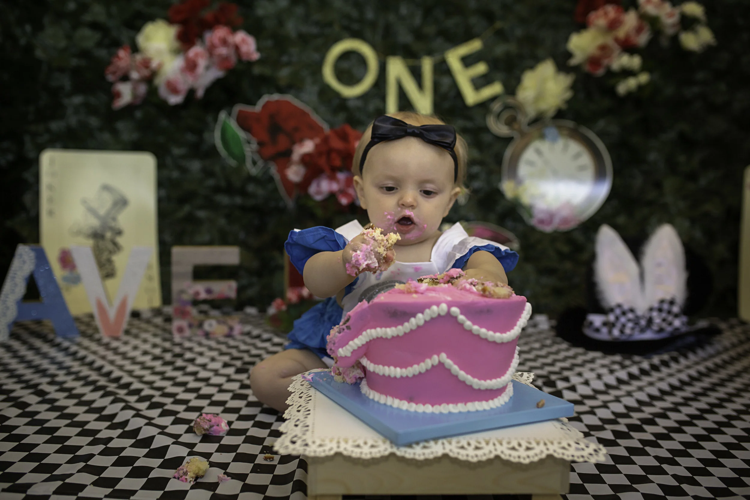 Alice in wonderland themed first birthday cake.