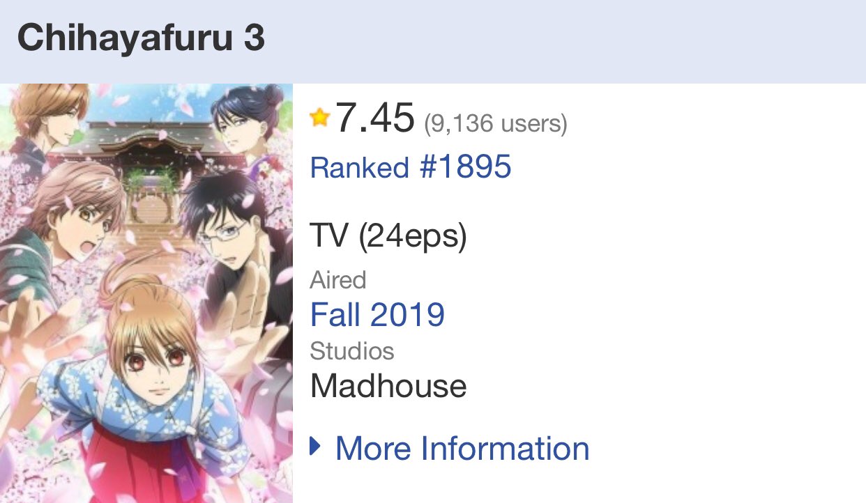 Chihayafuru 3s rating on mal. Winning the high school team tournament was a great accomplishment for the mizusawa members. 400 out of 5 loading.