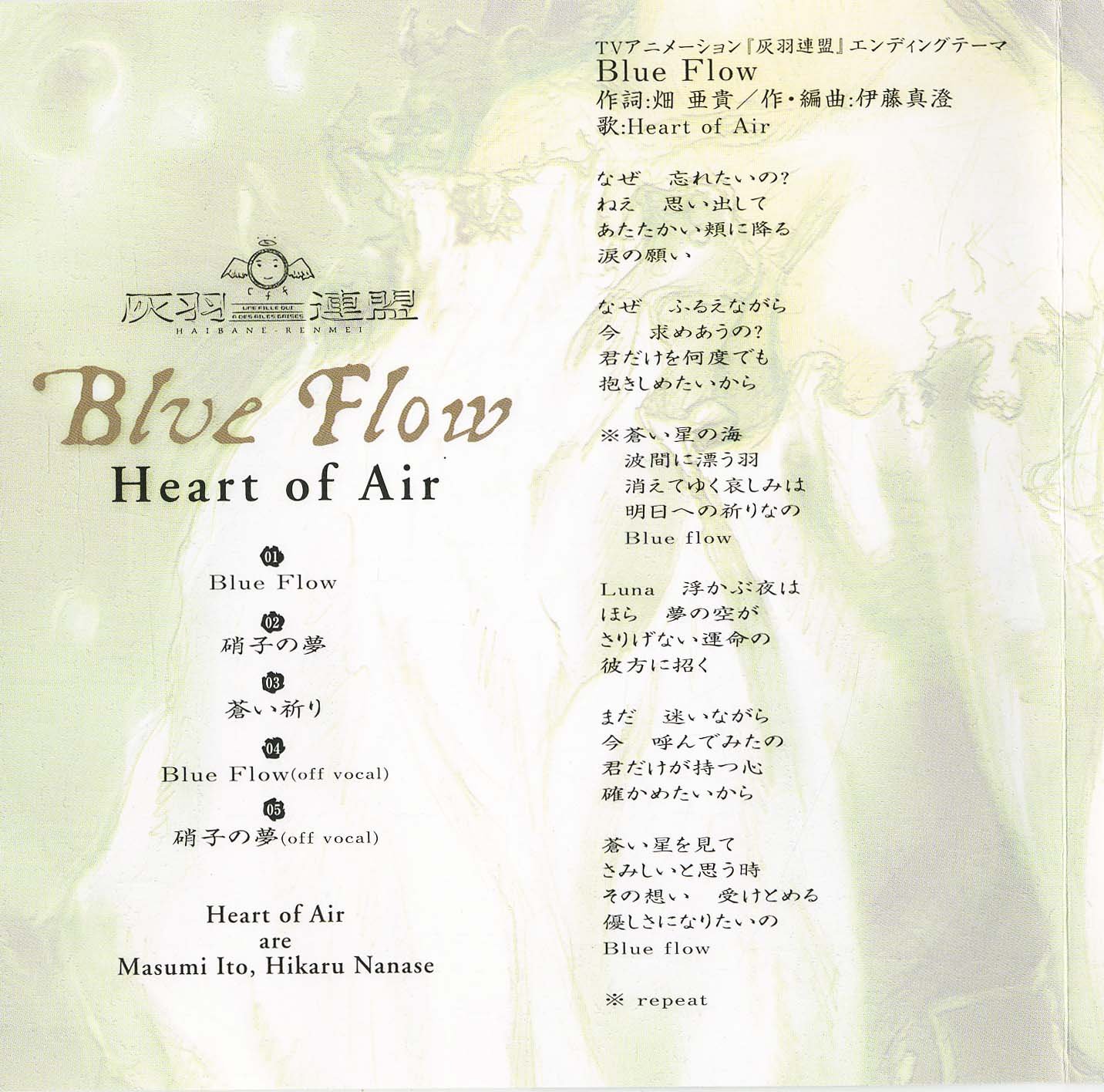 The sky of your dreams casually beckons you to the other side of fate while still lost i tried calling out to you just now i want to be sure of the heart that only you possess the times you look at the pale stars and think. Haibane renmei image album seinaru doukei laca 5147. Haibane renmei 20021122 heart of air blue flow edscansblister injpg 28537kb 20021122 heart of air blue flow edscansblister outjpg 11790kb 20021122 heart of air blue flow edscanscdjpg 8565kb. The disk arrived fairly quickly from japan and though was not new was in perfect condition.