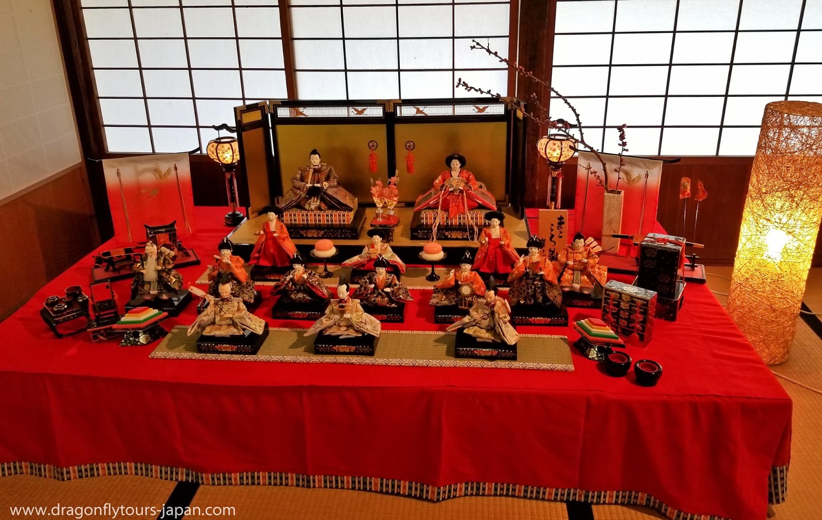 Traditionally families with young girls set up platforms covered with a red carpet to display a set of ornamental dolls the represent the emperor empress and royal subjects in traditional attire.