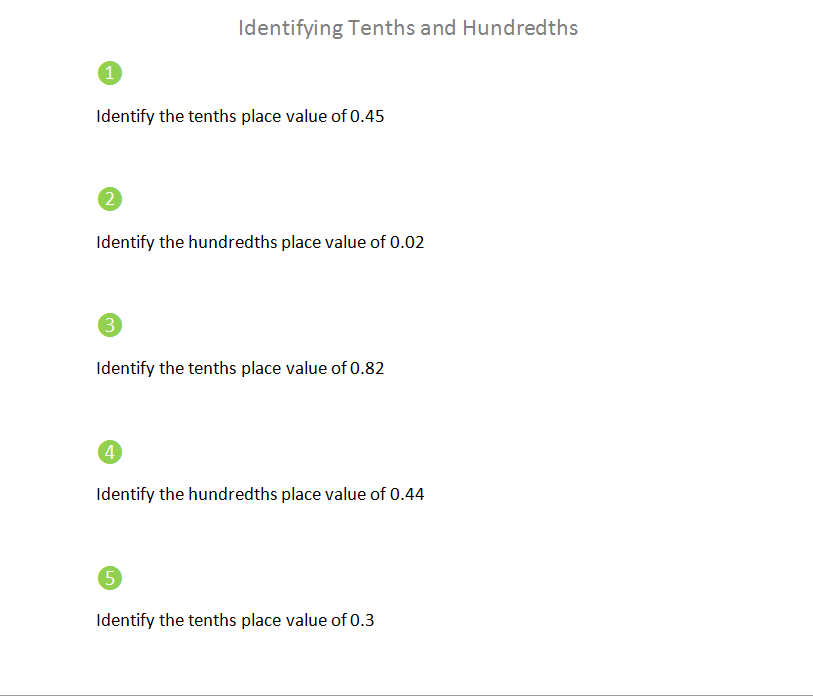 The hundredths place of a decimal number is two places to the right of the decimal point. Numbers with place value.