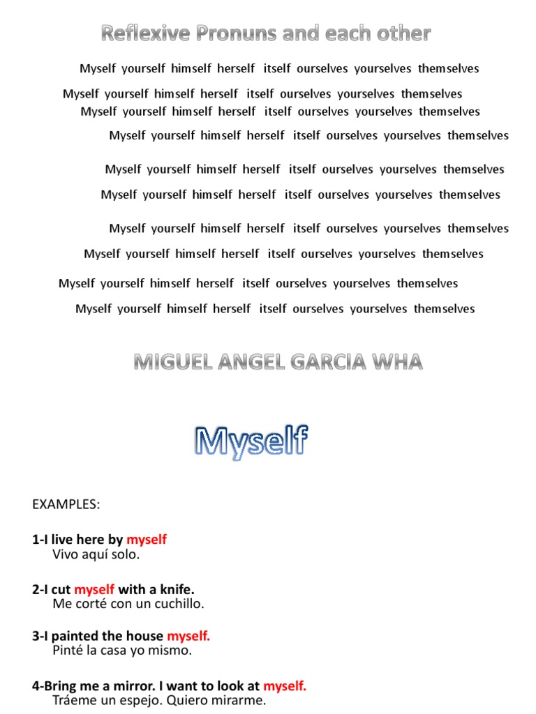 They are very happy with. Myself yourself itself himself herself ourselves yourselves themselves 1. She spoke to me herself. Myself yourself himself herself itself ourselves yourselves themselves or each other.