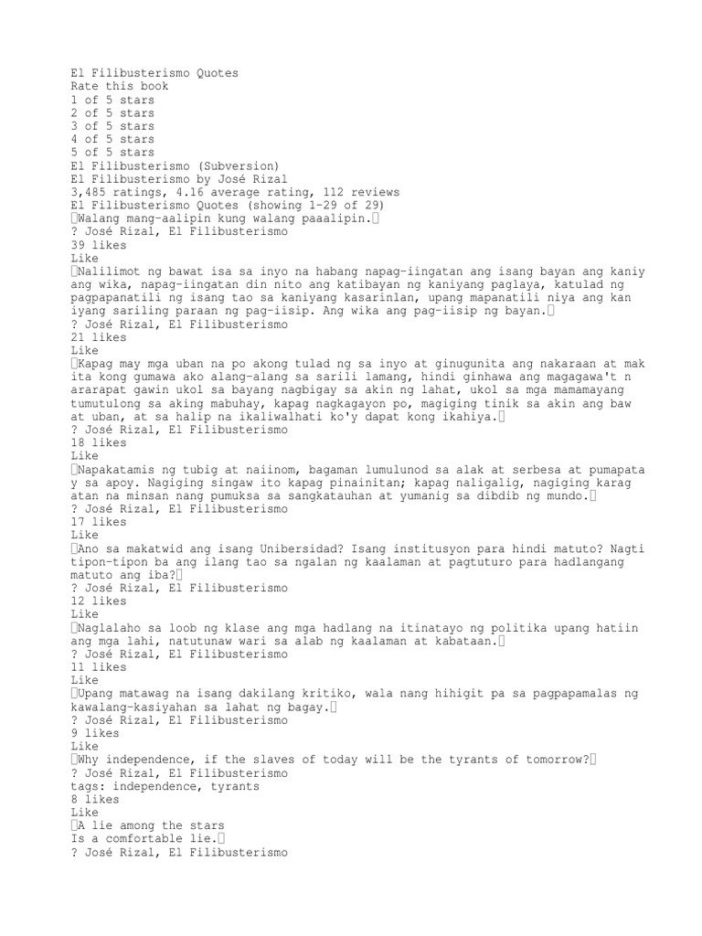 Gusto mo bang kumita sa internet nang pa facebook facebook lamang. 109 quotes from jose rizal. El filibusterismo was published in 1891 and is now part of the teachings in the secondary level or high school in the philippines to this day. Walang mang aalipin kung walang paaalipin.