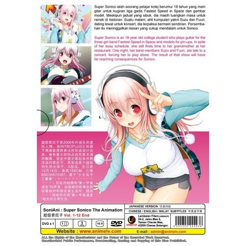 Looking for information on the anime soniani. Super sonicos classes end and she heads to her part time job to model. Between her modeling career college classes and performing in a rock band sonico takes life one gig at time. Super sonico debuted as nitros live mascot girl and her world will be brought to life in the anime soniani super sonico the animation.